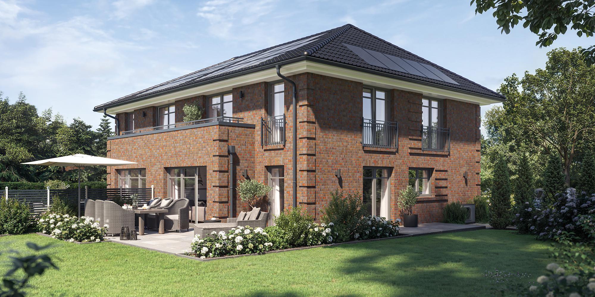 Exklusive Details wie der Flachdach-Zwerchgiebel, das Ziermauerwerk und die moderne, zeitlose Architektur verleihen dem Haus das gewisse Etwas.