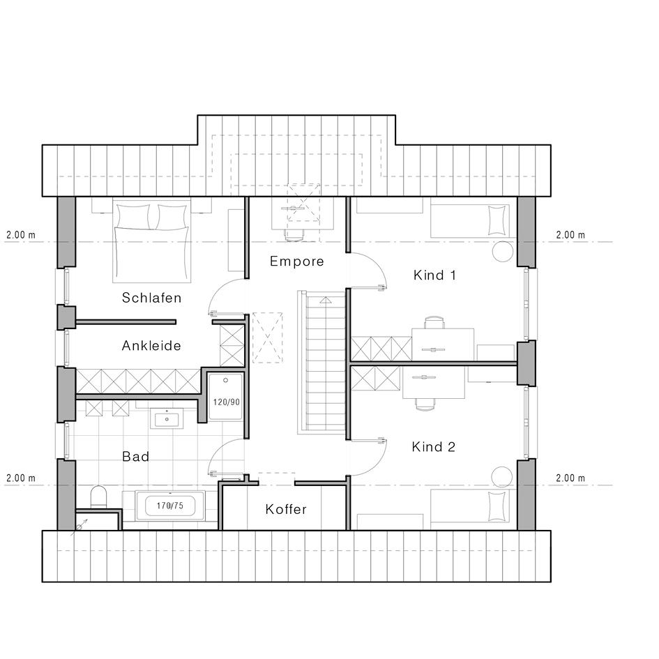 Unser Bestseller! Dank der komfortablen Drempelhöhe und der bodentiefen Fenster wirken alle Räume im Dachgeschoss weit und groß. Auch ein drittes Kinderzimmer ist hier möglich.