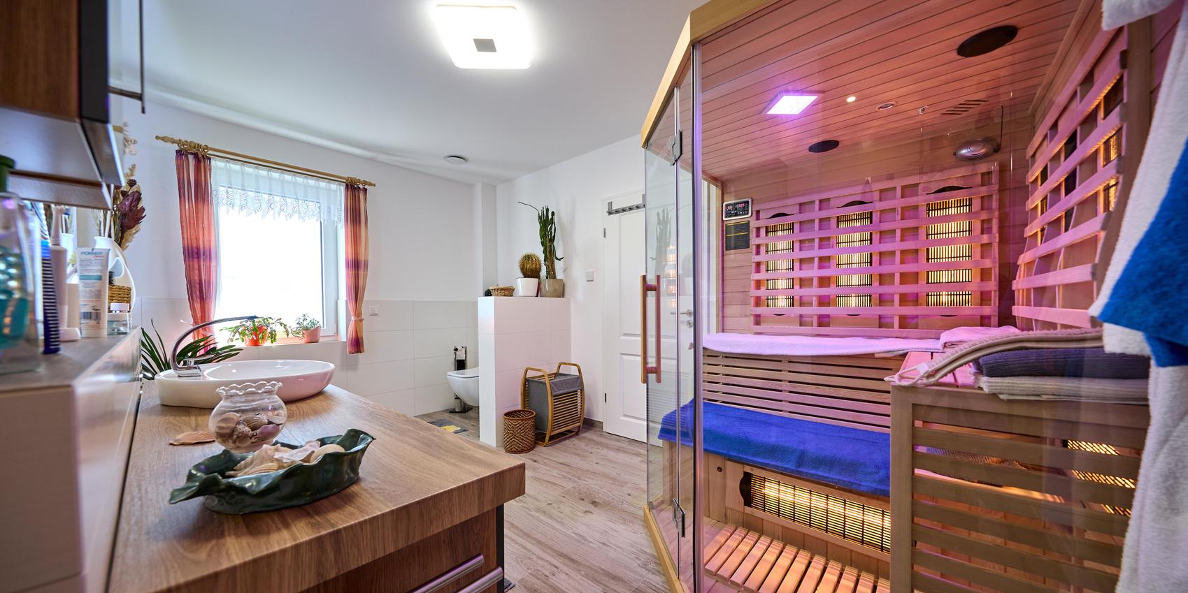 Im rechten Flügel des Gebäudes befindet sich ein großes Schlafzimmer mit Ankleide und angrenzendem Wellnessbad mit integrierter Sauna. »Unser größtes Highlight ist sicherlich unser Badezimmer. Wir haben schon bei der Planung viel Wert daraufgelegt, dass man sich hier wohlfühlen kann«, erzählt Andrea Berg. Bei der Gestaltung des Grundrisses konnten alle Wünsche des Paares berücksichtigt werden. Vom Kataloghaus haben sie nur den Baukörper übernommen und die Räume neu angeordnet. Andrea Berg sagt: »Die Raumaufteilung ist genauso, wie wir sie uns vorgestellt haben.« Dass Viebrockhaus all das möglich gemacht hat, begeistert das Paar auch jetzt noch: »Das war schon super«, lacht Matthias Berg zufrieden.