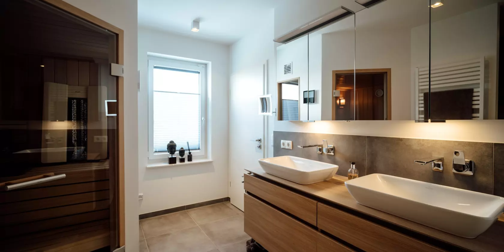 Für den Übergang vom Eingangsbereich zum Wohn-Essbereich haben sich Marion und Dirk Nagel ebenfalls für eine Schiebetür entschieden, diesmal aus Glas. Links vom Eingangsbereich, etwas versteckt, führt eine geschlossene, halb gewendelte Betontreppe ins Obergeschoss. Dank der vertikalen Fensterelemente ist der Treppenaufgang hell und großzügig. Dieses Gefühl von Weite setzt sich auf der luftigen Empore fort. Über dem Schreibtisch verläuft ein schmales Fenster, das einen tollen Ausblick bietet. Bei der Planung des Badezimmers griffen die Bauherren auf ihre Erfahrung im alten Haus zurück: »Wir haben auf eine Badewanne verzichtet und eine sehr große begehbare Dusche geplant«, sagt Marion Nagel. Hinzu kam noch eine Sauna, die sich dezent in den Grundriss des Raumes einfügt. Das Bad bekam zwei Türen: eine zum Schlafzimmer und eine zur Empore. Nach ihren Bauerfahrungen befragt, antworten Maron und Dirk Nagel: »sehr angenehm«. Den Bemusterungstermin im Dezember vergleichen sie – so wie einst der Bekannte, der ihnen Viebrockhaus empfahl – mit dem Kauf eines Autos: »Innerhalb von fünf bis sechs Stunden hatten wir alles angekreuzt und die Ausstattung festgelegt.« Ihr erklärtes Ziel war, noch vor Weihnachten im Einzugsjahr alles fix und fertig zu haben. Und das hat auch geklappt: am 23. Dezember zogen Marion und Dirk Nagel ein.