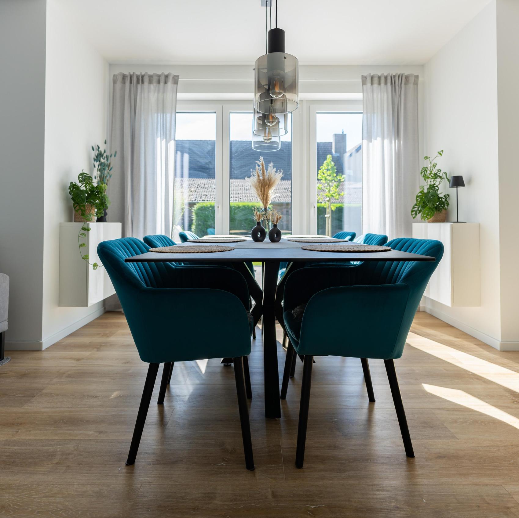 Was das Paar zunächst irritierte, war der Preis – allerdings nur so lange, bis der Besuch bei anderen Hausherstellern eine wichtige Erkenntnis reifen ließ: „Als wir die Angebote verglichen hatten, war Viebrockhaus einfach deutlich vorne: Was da alles im Preis an Leistungen inbegriffen ist, ist mehr als das, was alle anderen zu bieten hatten.“ Zumal das Maxime 300 als Effizienzhaus 40 mit dreifach verglasten Fenstern und perfekt gedämmter Gebäudehülle realisiert wurde. Ein weiteres wichtiges Argument für Viebrockhaus: die kurze Bauzeit. Auch sie gab den Ausschlag. „Selbst während des Winters, als es einen größeren Schneefall gab, wurde die Bauphase eingehalten. Es war ein großes Zelt über dem Haus aufgebaut und es wurde weitergearbeitet, als würde die Sonne scheinen“, schwärmt Christoph Blum. Auf 155 Quadratmetern ist wahrlich ausreichend Platz. Bereits die geräumige Diele bereitet ein ebenso freundliches wie zeitgemäßes Willkommen. Der beeindruckend großzügige Wohn-Essraum mit Sofaecke, großem Essplatz und offener Küche misst stattliche 44 Quadratmeter. „Der zusätzliche Giebel auf der Gartenseite hat uns das ermöglich“, so der Hausherr. „So können wir den Esstisch optimal platzieren und haben viel Tageslicht im gesamten Wohnbereich.“ Eine weitere Besonderheit ist die zweite Eingangstür im Haustechnikraum, sodass Laura und Christoph Blum z.B. die Einkäufe direkt vom Carport ins Haus bringen können.