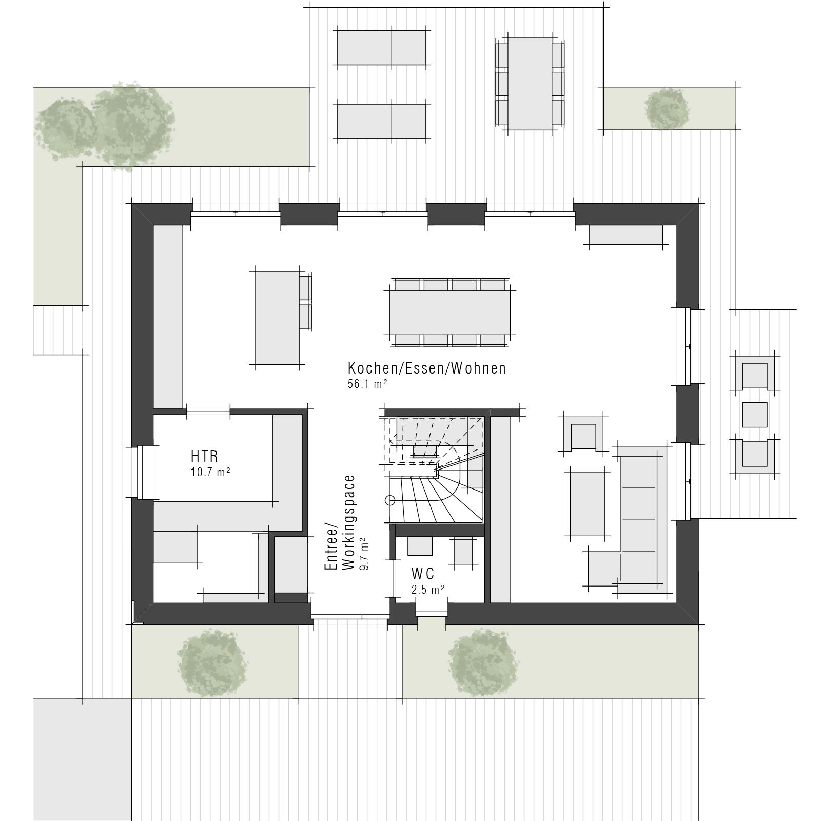Beim Betreten des Hauses empfängt Sie eine geräumiger Entree-Bereich. Von hier aus erschließen sich sowohl das WC als auch der offen gestaltete Wohn-, Ess- und Kochbereich, welcher das Herzstück des Erdgeschosses bildet. Er überzeugt mit seiner Großzügigkeit sowie direktem Zugang zur Terrasse und zum Garten. Große Fensterflächen sorgen für eine helle, freundliche Atmosphäre und schaffen fließende Übergänge zwischen Innen und Außen. Der clever gestaltete Haustechnikraum ist durch den Küchenbereich betretbar.