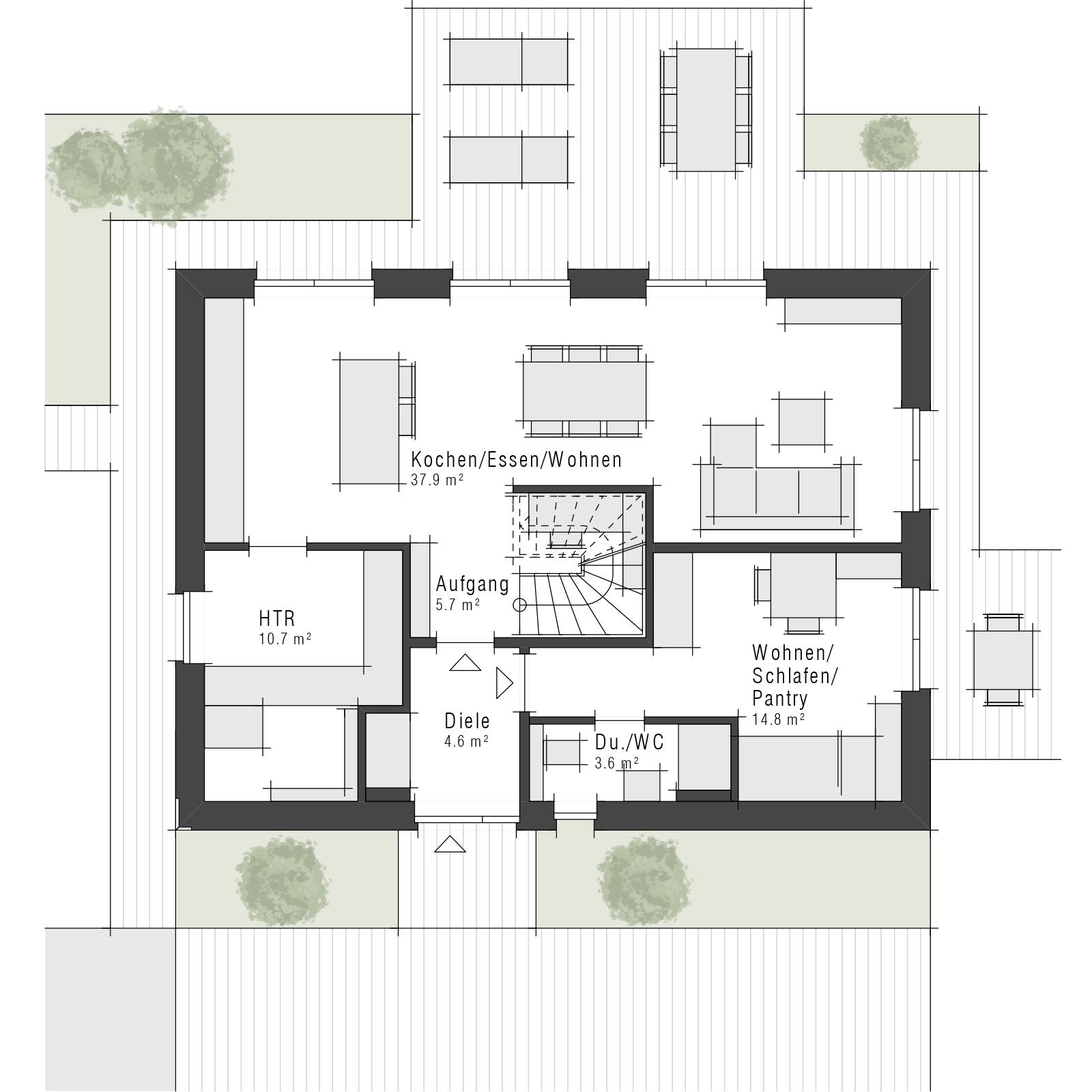 Ein besonderes Highlight bei diesem Erdgeschoss-Grundriss ist der separat zugängliche Einliegerbereich. Dieser umfasst ein kombiniertes Wohnen/Schlafen mit Pantryküche sowie ein eigenes Dusch-WC und bietet damit ideale Voraussetzungen für Gäste, erwachsene Kinder oder zur Vermietung. Die klare Trennung vom Hauptwohnbereich sorgt für Privatsphäre auf beiden Seiten und eröffnet vielseitige Nutzungsmöglichkeiten.