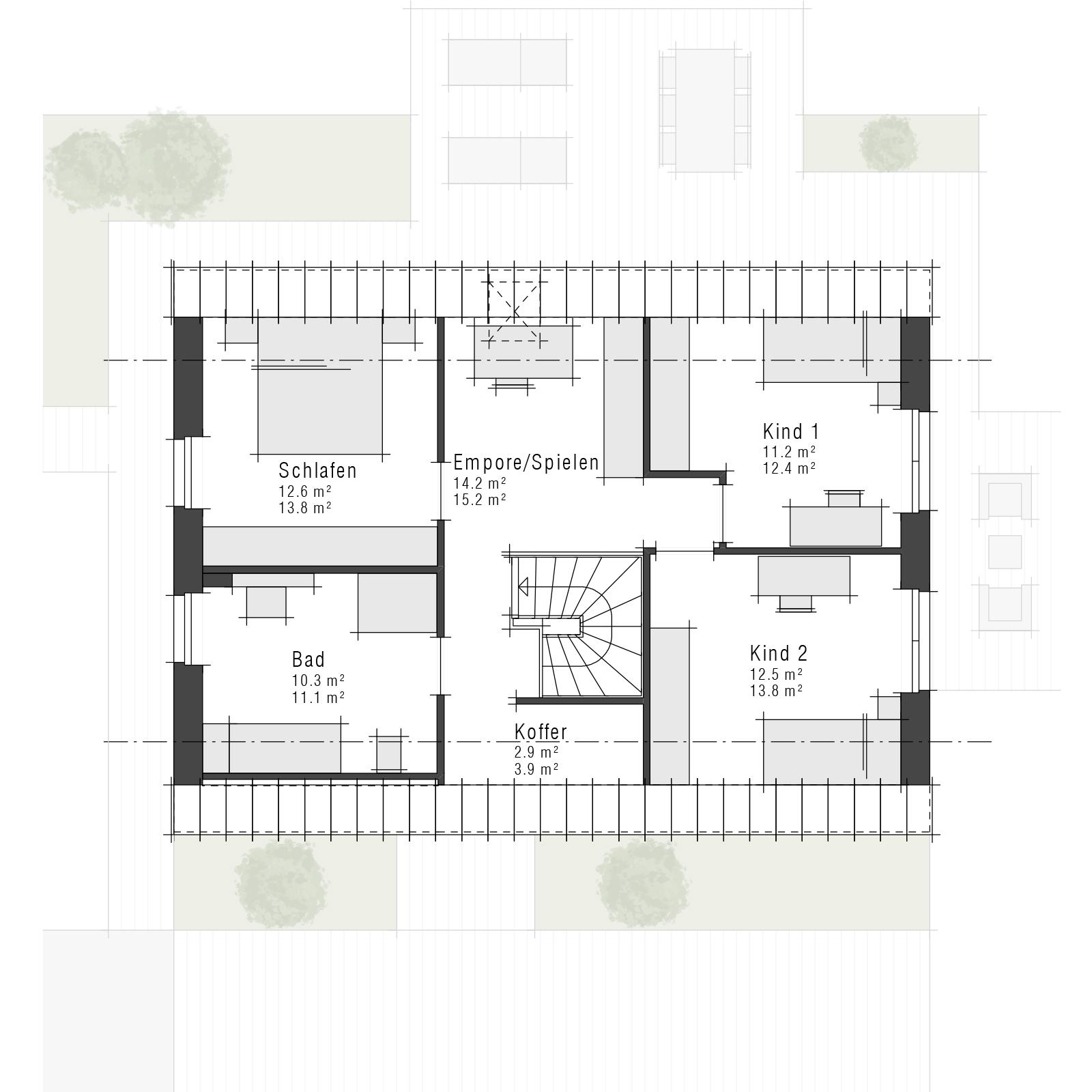 Im Dachgeschoss entstehen vielseitig nutzbare Rückzugsorte für die ganze Familie. Zwei großzügige Kinderzimmer, ein Elternschlafzimmer sowie ein komfortables Bad bieten viel Platz zum Leben und Entspannen. Praktische Abstellflächen ergänzen das Raumangebot. Ein Highlight ist die offene Empore, die sich flexibel als Spiel-, Arbeits- oder Loungebereich nutzen lässt und für zusätzliche Großzügigkeit sorgt. Optional schafft ein Luftraum im Zentrum ein noch offeneres, besonderes Raumgefühl.